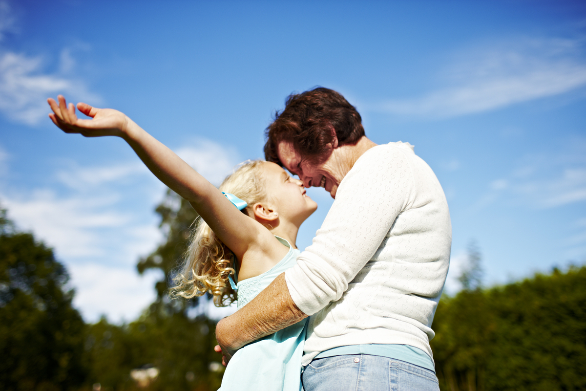 Smilende bestemor og barnebarn som holder om hverandre