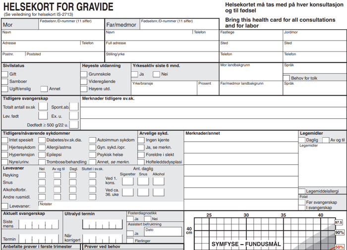 The information given on the health card will be important for your pregnancy and birth. This could be information about previous pregnancies, medical conditions that may require follow-up, and other background information. Information and measurements from throughout your pregnancy will be entered in connection with your pregnancy consultations.