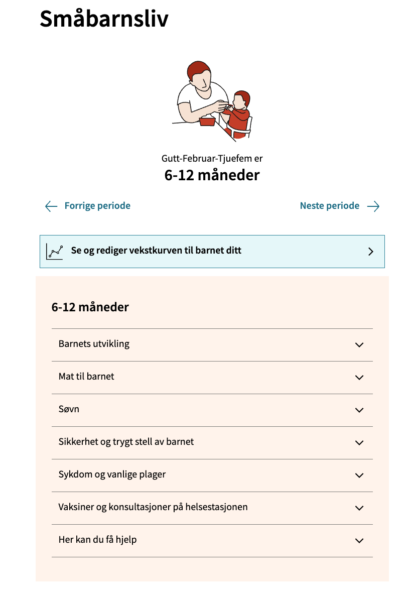 Når du loggar inn på tenesta Småbarnsliv, får du opp namnet på barnet ditt og perioden barnet ditt er i. Perioden er alderstrinnet til barnet ditt.