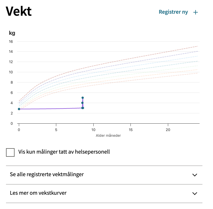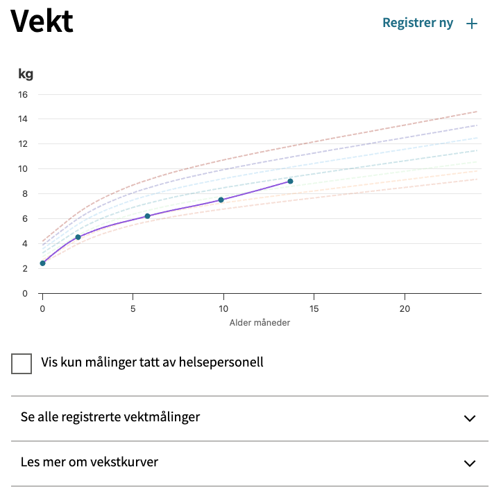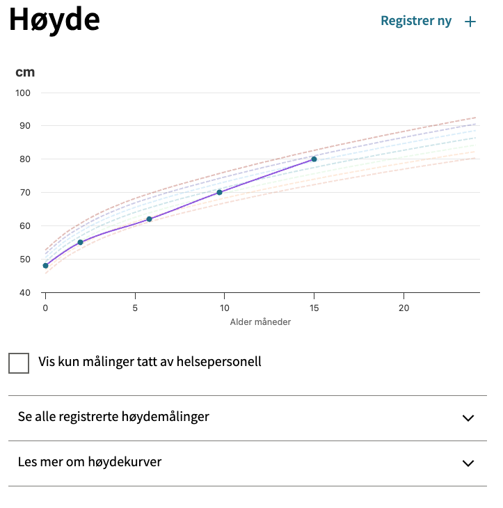 I tenesta kan du òg registrere høgda og vekta til barnet sjølv, til dømes etter kontroll på helsestasjonen. Helsepersonell gjer ei heilskapsvurdering av måleresultata over tid, i samanheng med blant anna andre målingar, allmenntilstanden og sjukehistoria til barnet.
