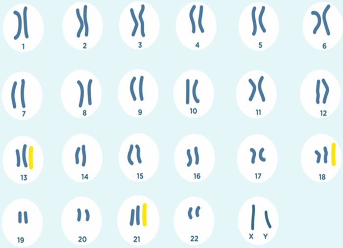 Den vanligste av disse er trisomi 21, også kjent som Down syndrom. Trisomi 13 og trisomi 18 er sjeldnere enn trisomi 21.