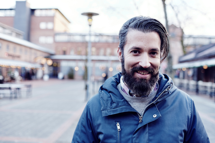 Smilende mann på et torg